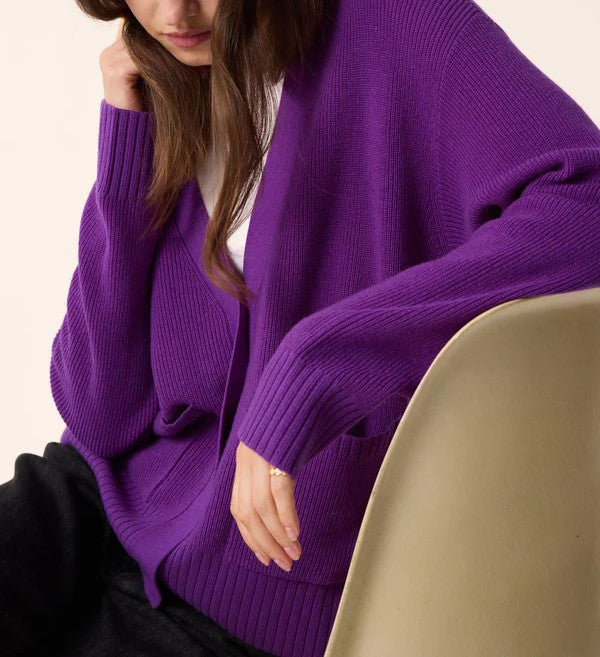 The Artimus Cardigan is the perfect addition to your autumn wardrobe. Its oversized, ribbed design is both cozy and versatile, while the gold-colored buttons and patch pockets add a touch of style. Made from merino wool, this cardigan will keep you warm and chic all season long.