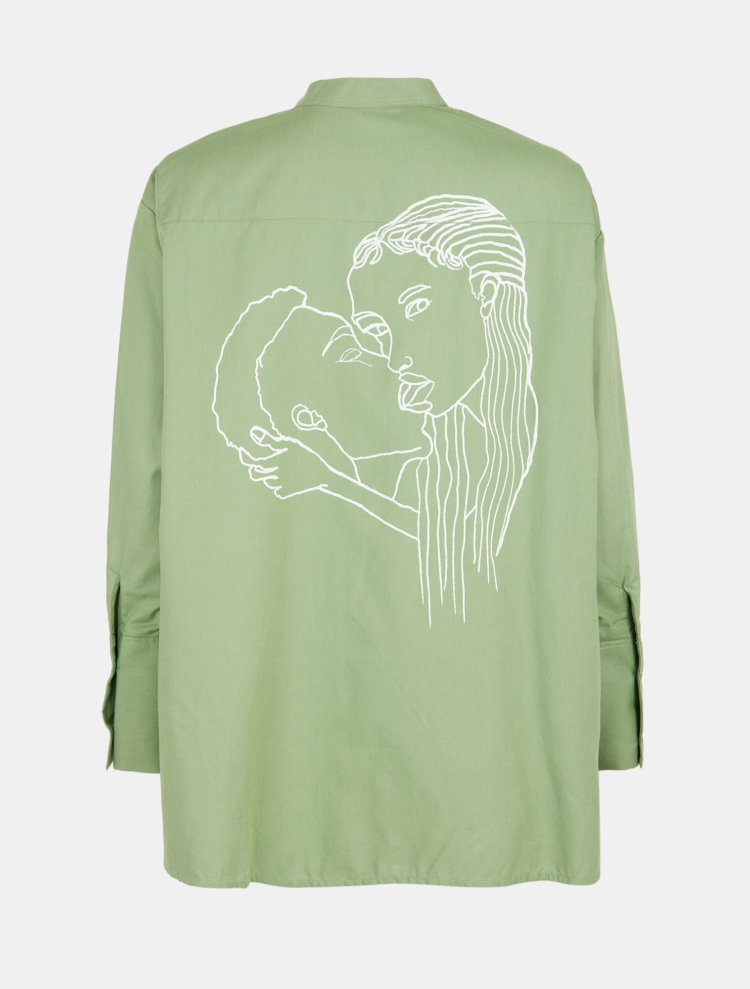 This limited-edition cotton-blend shirt from the Loved To Love capsule is a fusion of contemporary tailoring and expressive artistry. Designed with a structured yet fluid silhouette, it features a sharp band collar, asymmetric hem, and elongated cuffs for a refined yet effortless aesthetic. The breathable, lightweight cotton blend ensures comfort, making it a versatile staple. The back showcases an exclusive hand-painted artwork by Jess DSO, a London-based artist and textile designer known for her minimalist yet emotionally charged linework. Capturing an intimate moment in bold yet delicate strokes, the design transforms this classic piece into a wearable statement. Crafted with sustainability at its core, this shirt embodies the ethos of circular fashion—where creativity, craftsmanship, and conscious design intersect.