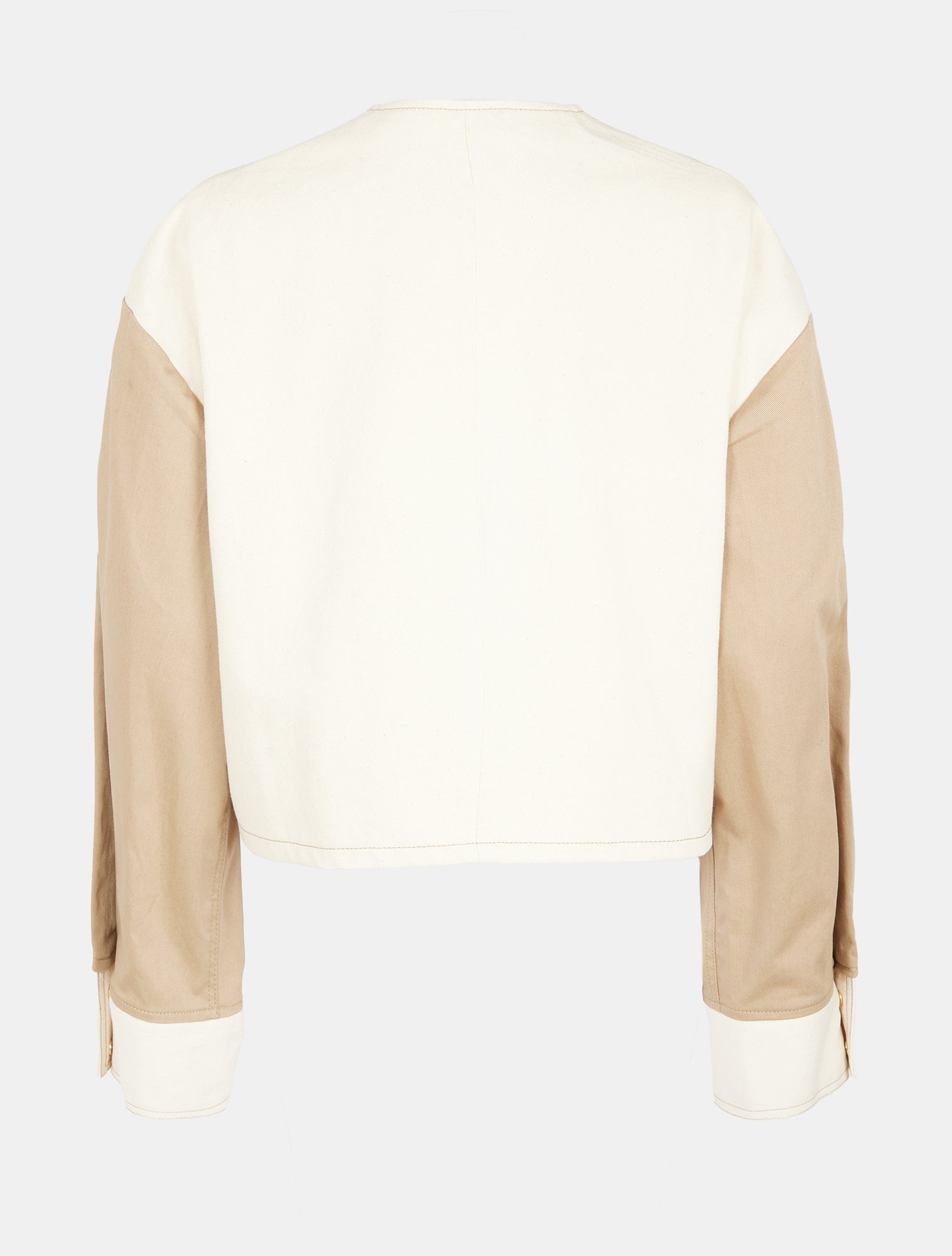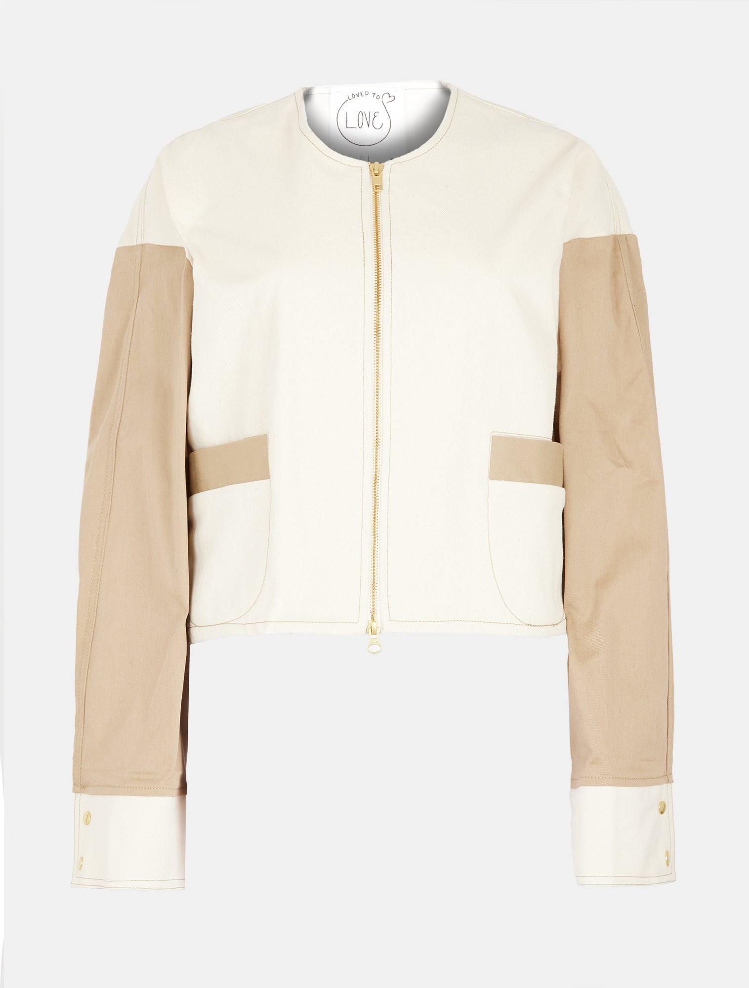 This limited-edition zip-up jacket is part of Loved To Love, a circular fashion capsule dedicated to reimagining sustainability through thoughtful design. Made from 100% repurposed denim, it gives new life to existing materials while maintaining a refined, modern aesthetic. The structured silhouette features a clean, minimalist front with oversized pockets, contrast paneling in soft neutrals, and precise topstitching that highlights its architectural lines. Gold-tone hardware and extended cuffs with button details add a polished finish, while the cropped cut ensures effortless layering. Designed for a future where style and sustainability go hand in hand, this exclusive piece embodies the essence of conscious fashion.