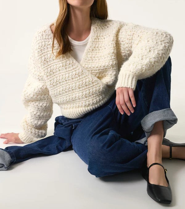 Get the folksy look with the Astro crochet-effect knitted cropped jumper, featuring a V-neck and puffball sleeves. Designed in a wrapover style, this cream white jumper is made with a new Italian yarn that's mulesing-free and provides warmth and softness. Pair it with high-waisted trousers for a trendy, cropped look.