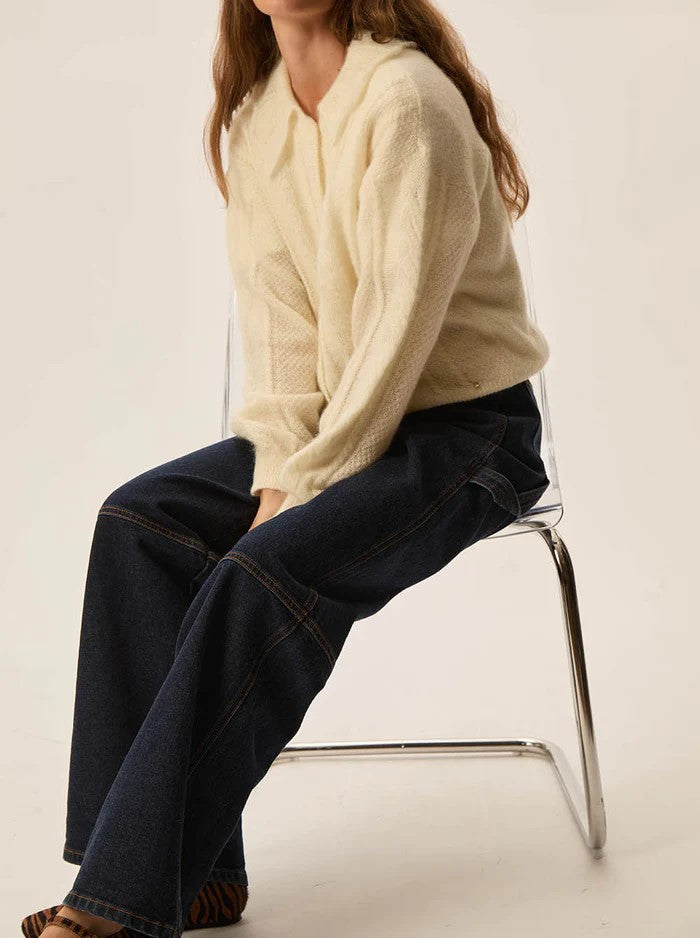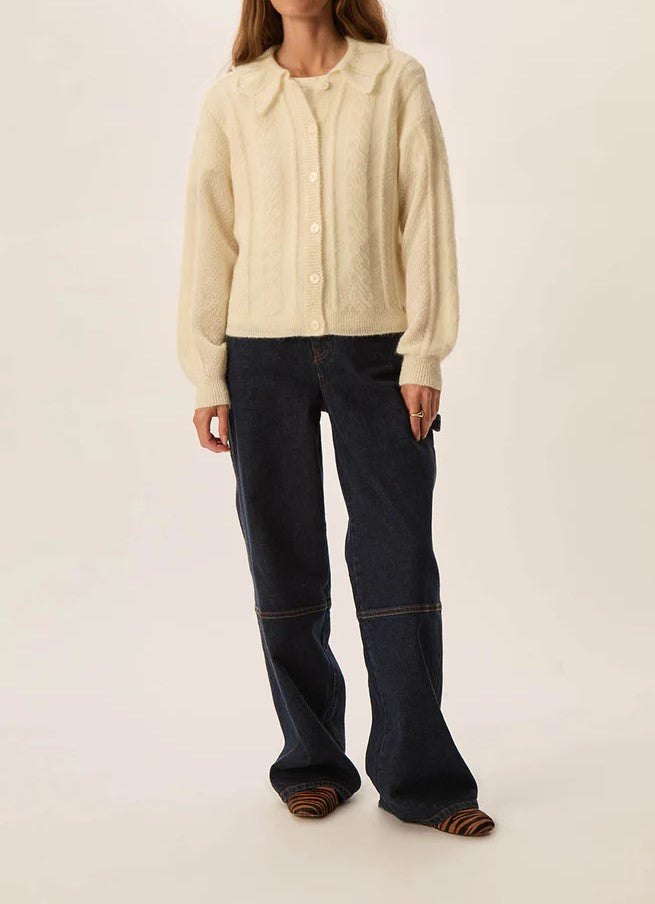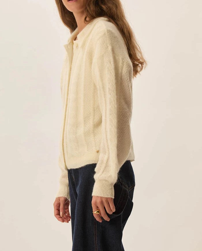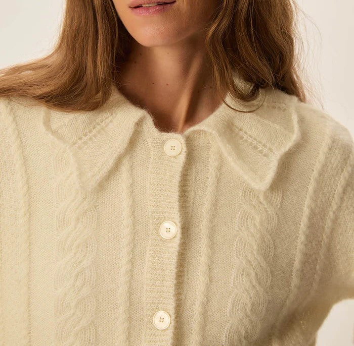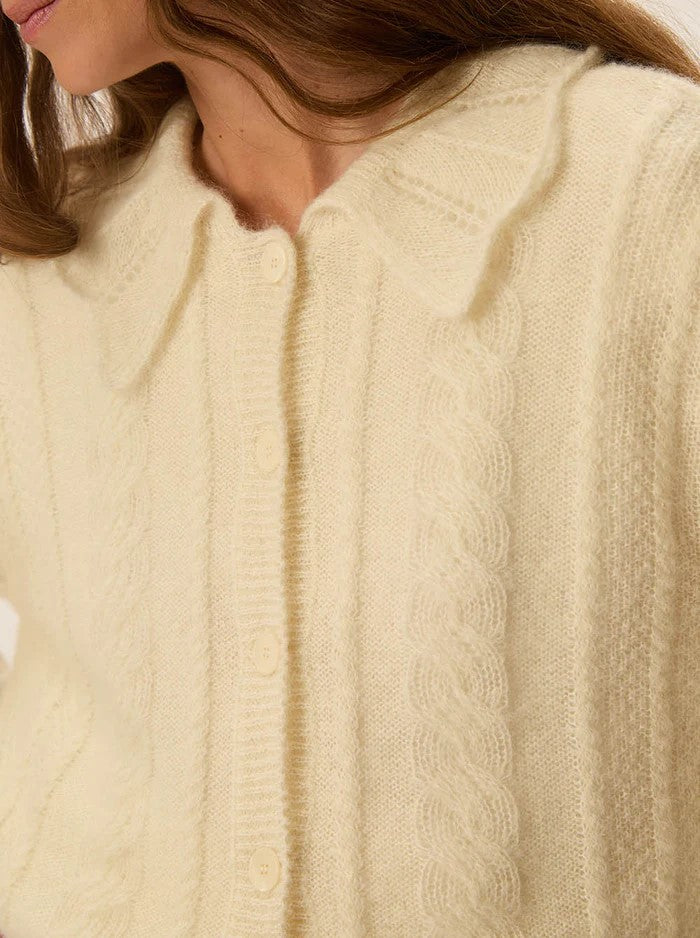 The Capucine Cardigan is more than just a layer—it’s a showcase of artisanal detail. Knitted from luxurious super kid mohair and baby alpaca, it balances warmth with lightness. Its braided cables, openwork stitches, and ruffled collar bring a soft bohemian elegance, making it a timeless piece for autumn layering.