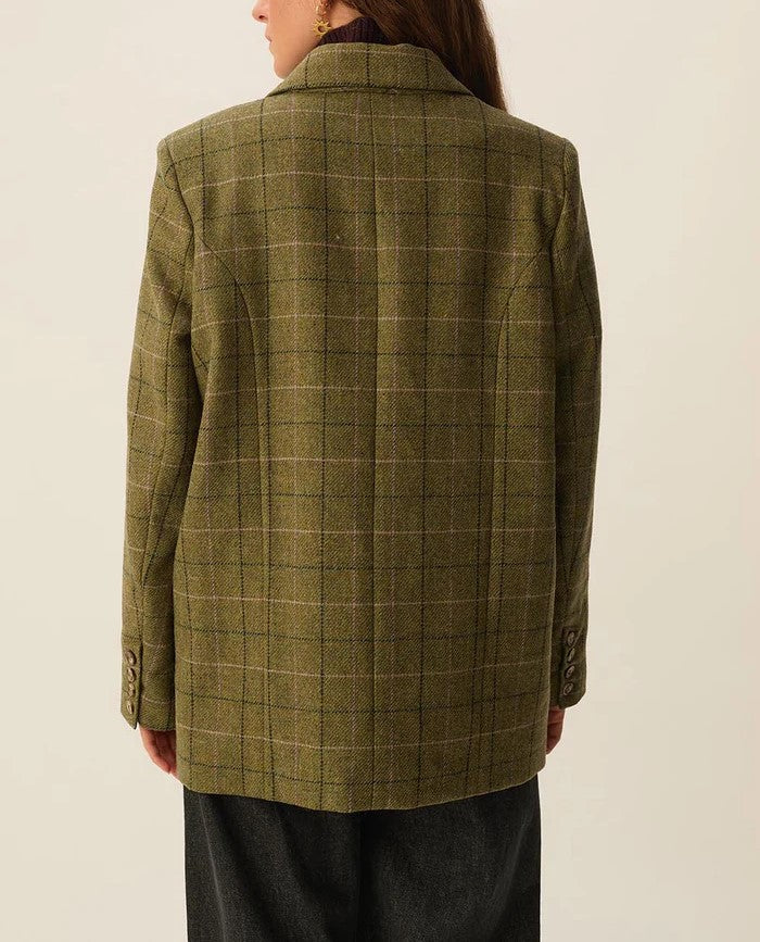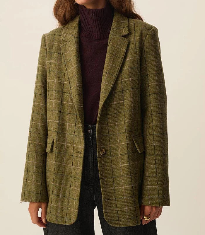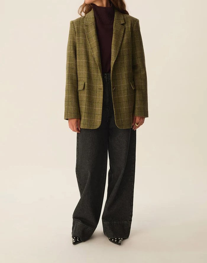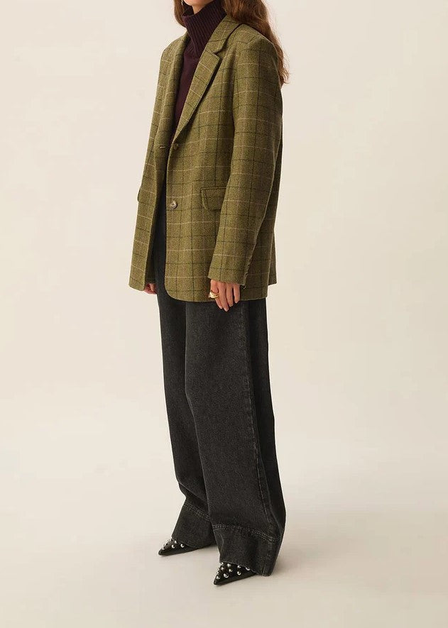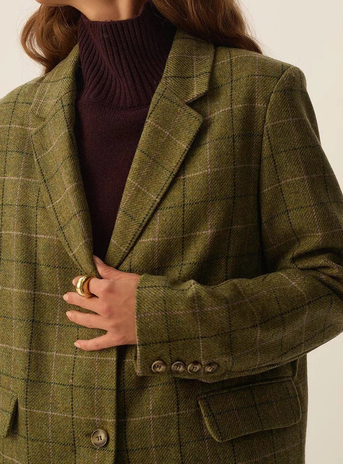 The Silvestre Jacket elevates the classic suit blazer with sharp structure and playful pattern. Designed with a straight cut and shoulder pads for definition, it’s crafted from certified virgin wool in an olive-green check—combining preppy chic with winter warmth. A versatile piece to dress up jeans, trousers, or skirts.