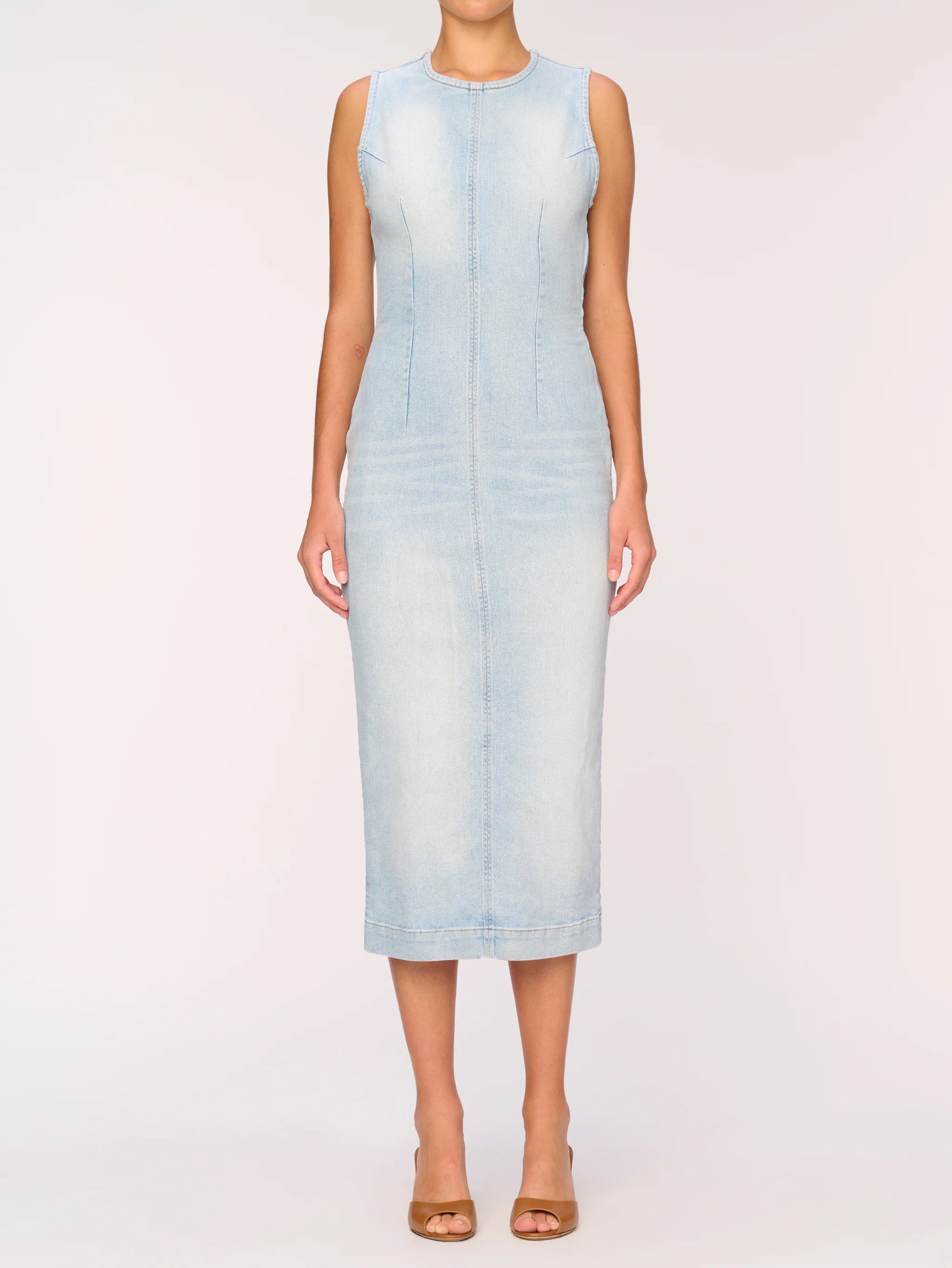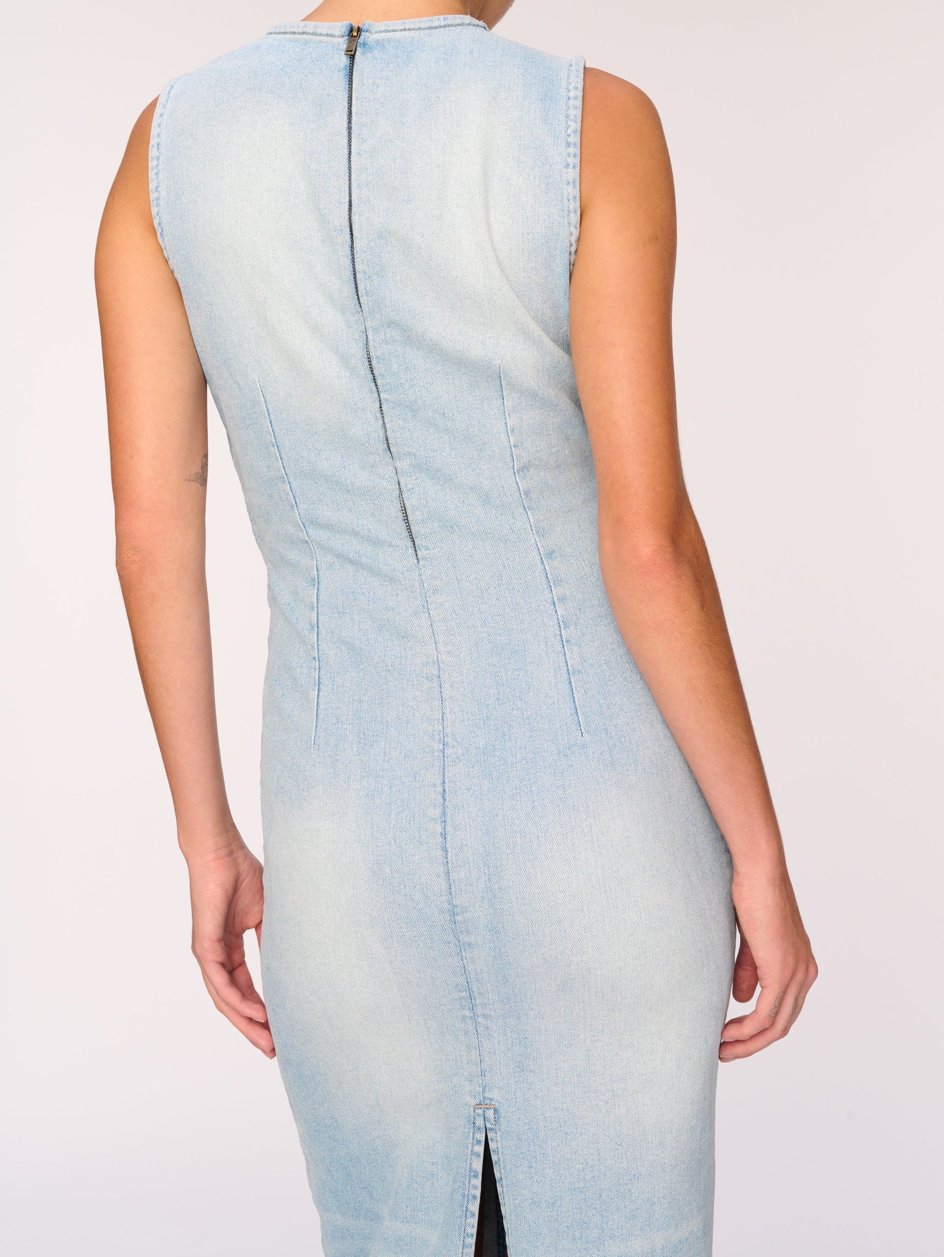 Expertly crafted, this form-fitting midi dress features a sleeveless cut, round neckline, and hidden zippers for a seamless finish. With a flattering sheath silhouette that accentuates your curves and a full-length zipper and vent for ease of movement, this dress is perfect for any occasion. Dress it up or down, and accessorize it to your heart's content for a versatile and stunning look.