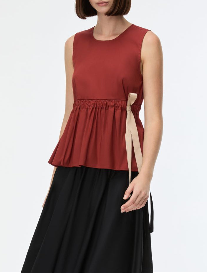 The below-bust gathered detail will streamline and flatter all figures. Available in Ruby and Sand.