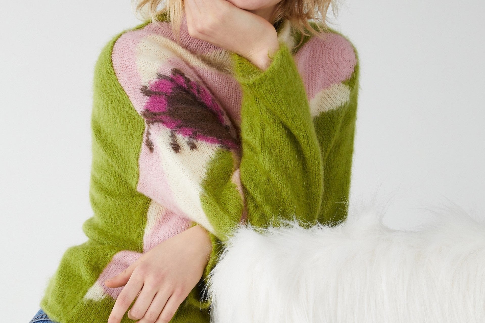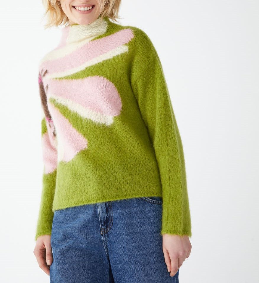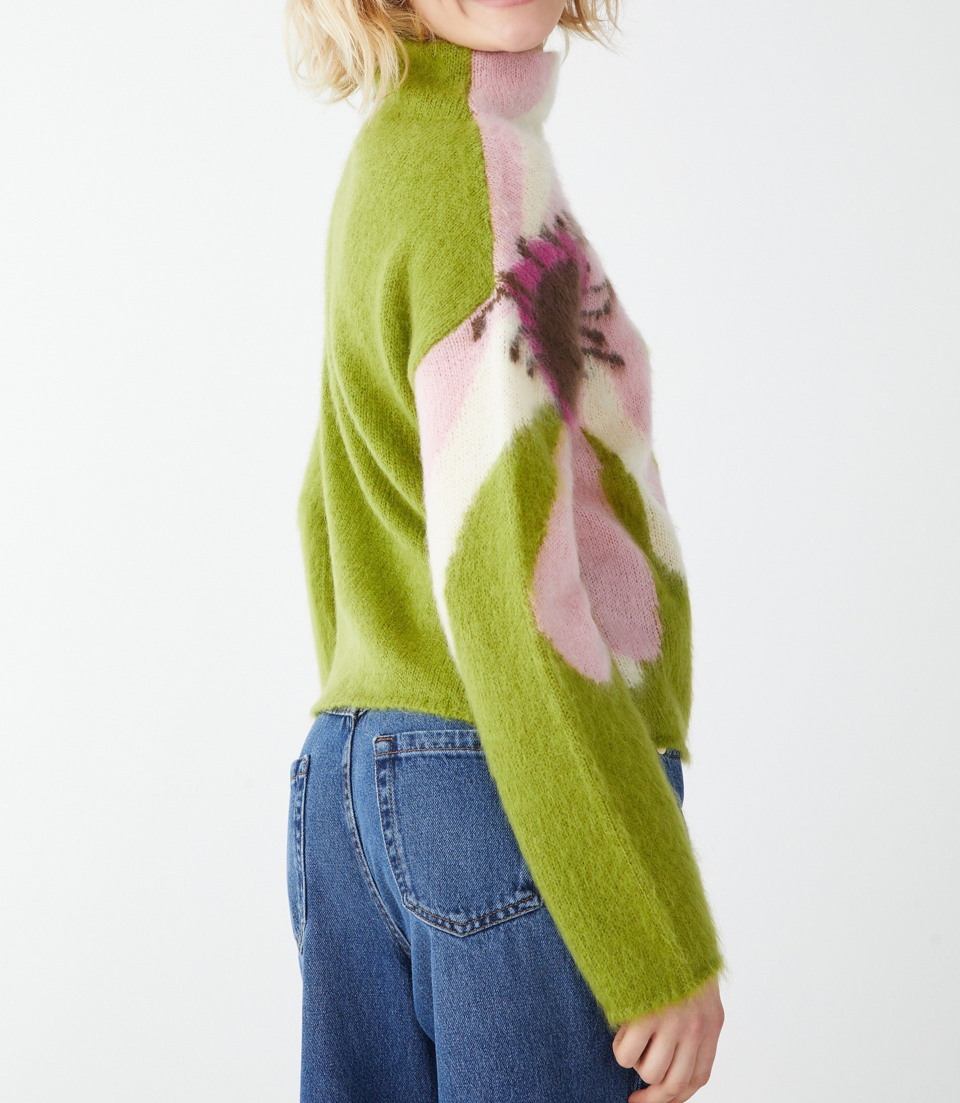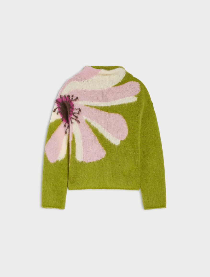 This mohair-blend yarn sweater features an eye-catching inlaid pattern for a bold, head-turning daytime look. Its straight and relaxed fit, along with a cozy funnel neck and long sleeves, provide both style and comfort. Perfect for staying warm and stylish this season.