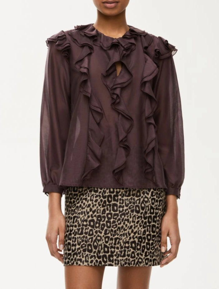 The Cleopatra Blouse brings soft structure and delicate detail to your everyday rotation. Crafted from a lightweight silk and cotton-blend muslin, it features a ruched collar, gathered shoulders, and a softly decorated front that adds dimension without overwhelming the silhouette. Designed with a relaxed fit and long sleeves finished with buttoned cuffs, this blouse balances elegance with ease. Juxtapose it with sporty jeans to play with contrasts, or tuck it into tailored trousers for refined appeal.