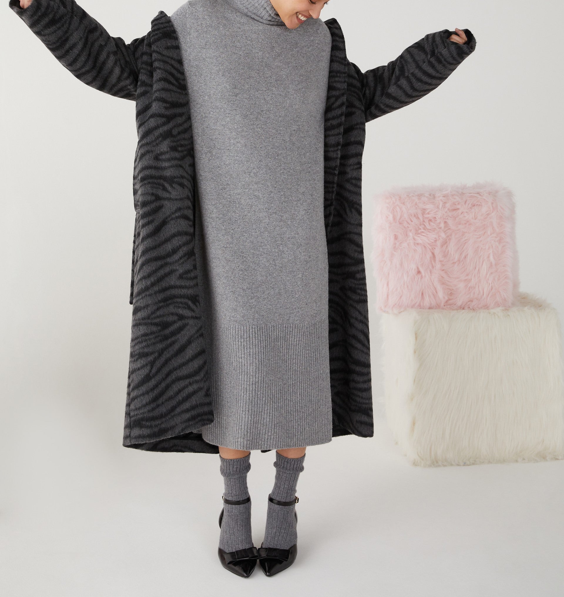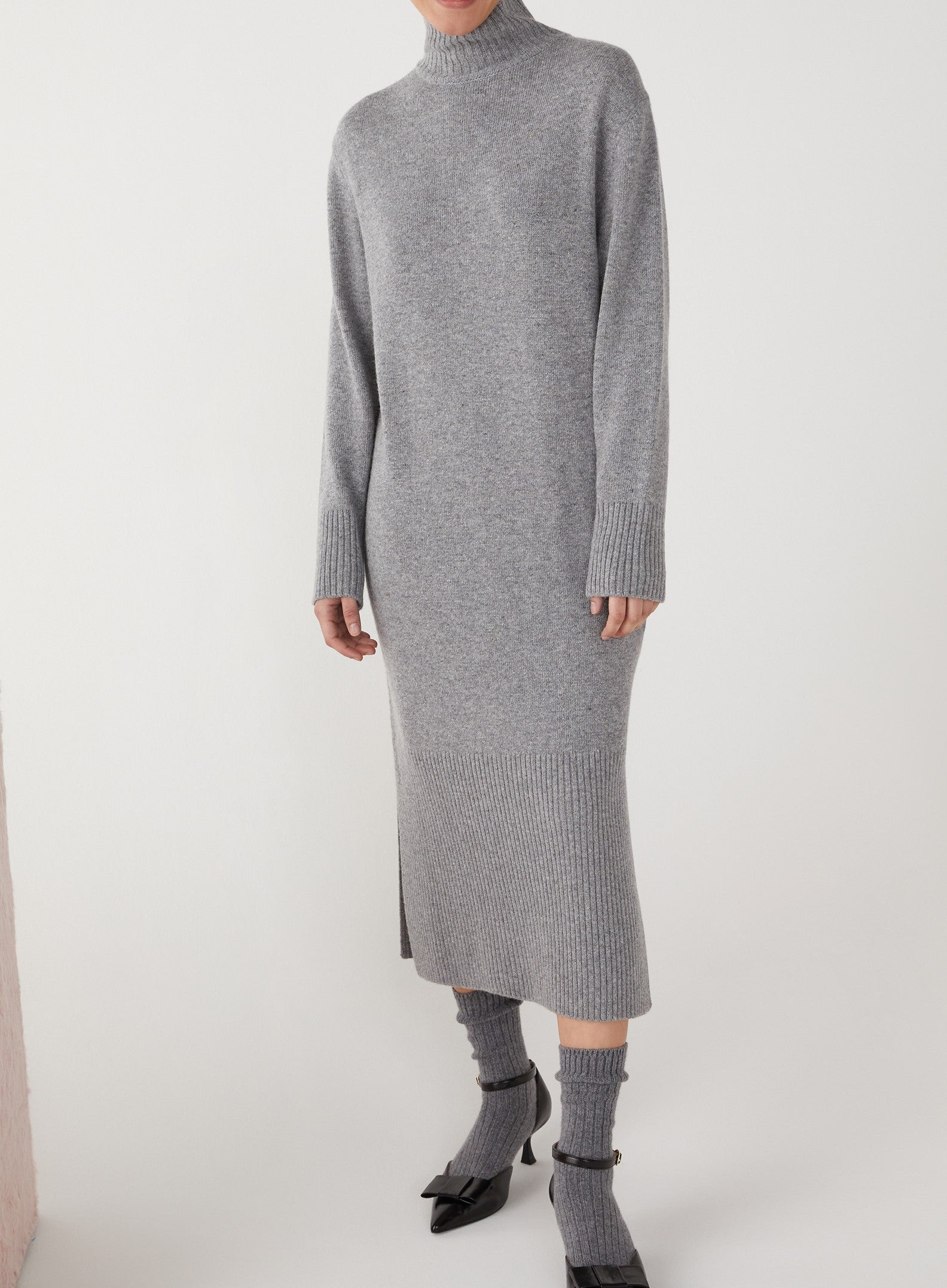 This long wool-blend knit dress effortlessly adds a touch of chic to your daytime look. The straight fit, high neck, and long sleeves provide both comfort and style, while the hem slits and rib-knit trims add a unique touch. Perfect for making any outfit special.
