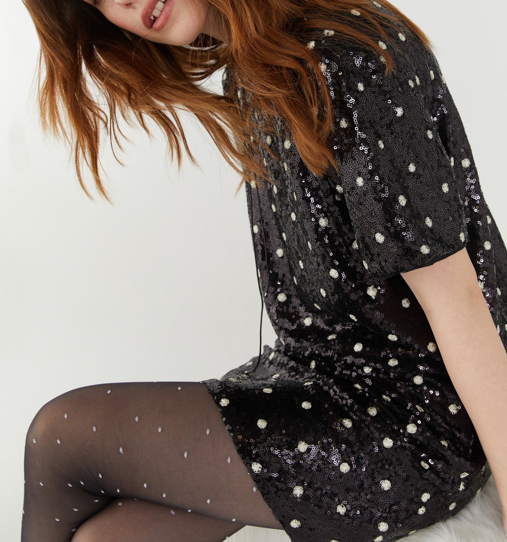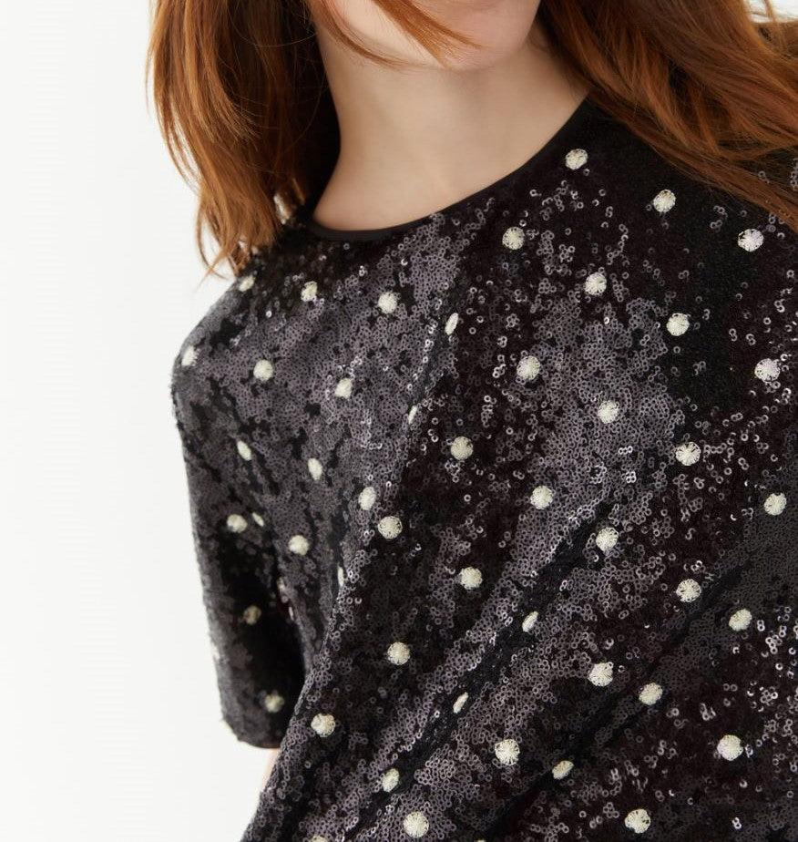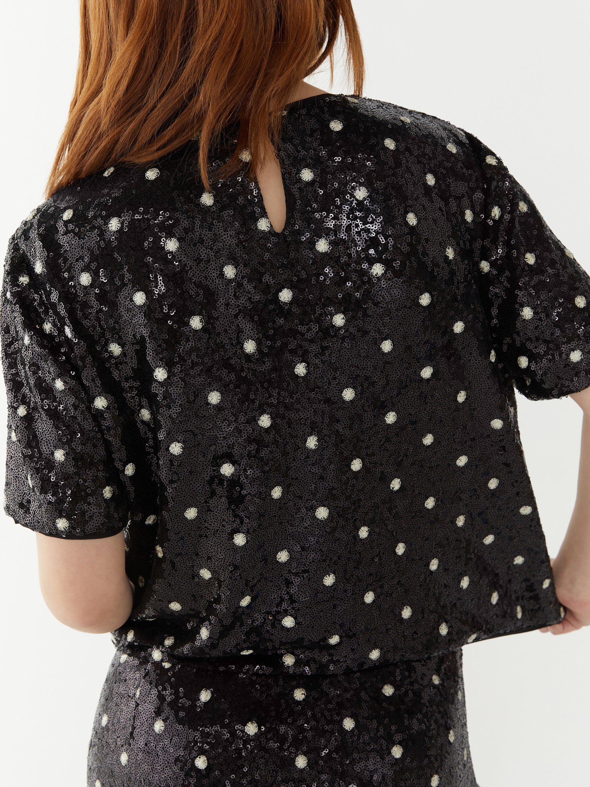 Elevate your evening attire with this stunning sequin jersey T-shirt. Its embroidered polka dot detail adds a touch of sophistication and the boxy fit flatters all body types. Complete the look with the matching skirt for a showstopping ensemble. Short sleeves, a round neckline, and a keyhole detail make this a must-have piece. Lined for extra comfort.