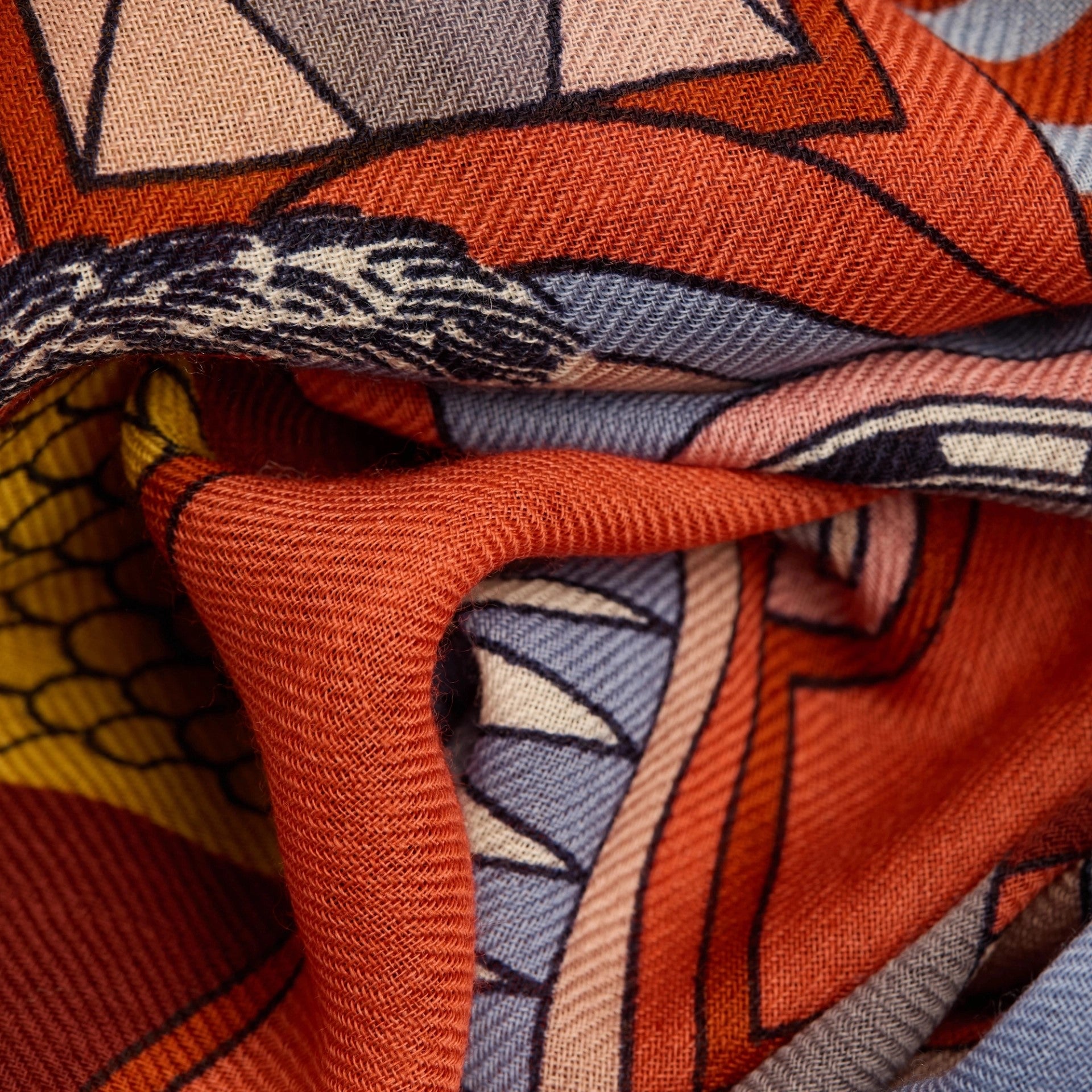 The Nicolas Scarf transforms architecture into wearable art. A lively composition of geometric arches, trees, and abstracted creatures is woven in pure wool, set against a palette of warm brick tones, sky blues, and golden accents. Its large rectangular shape makes it versatile to drape or wrap, offering both warmth and a bold graphic statement.