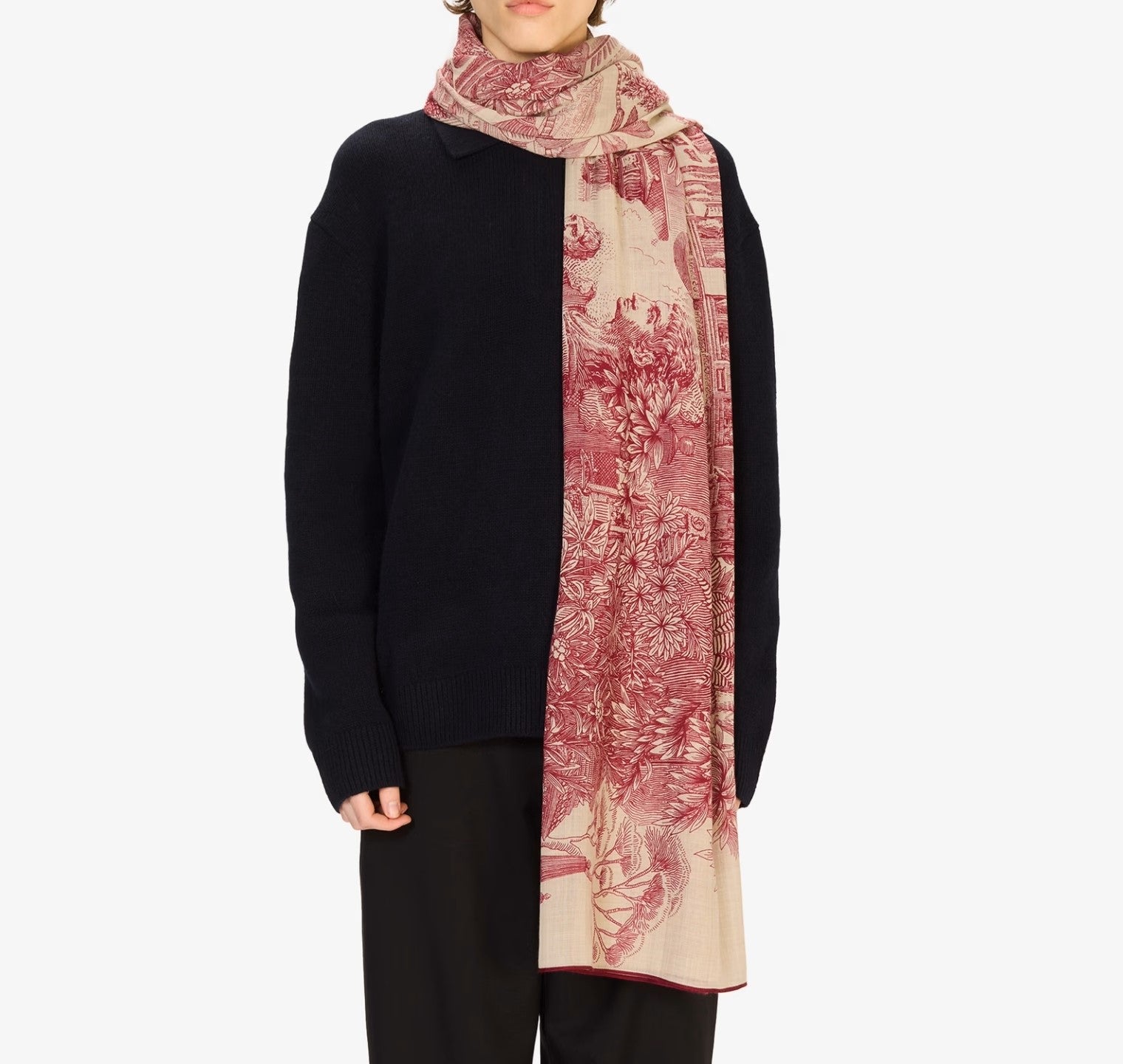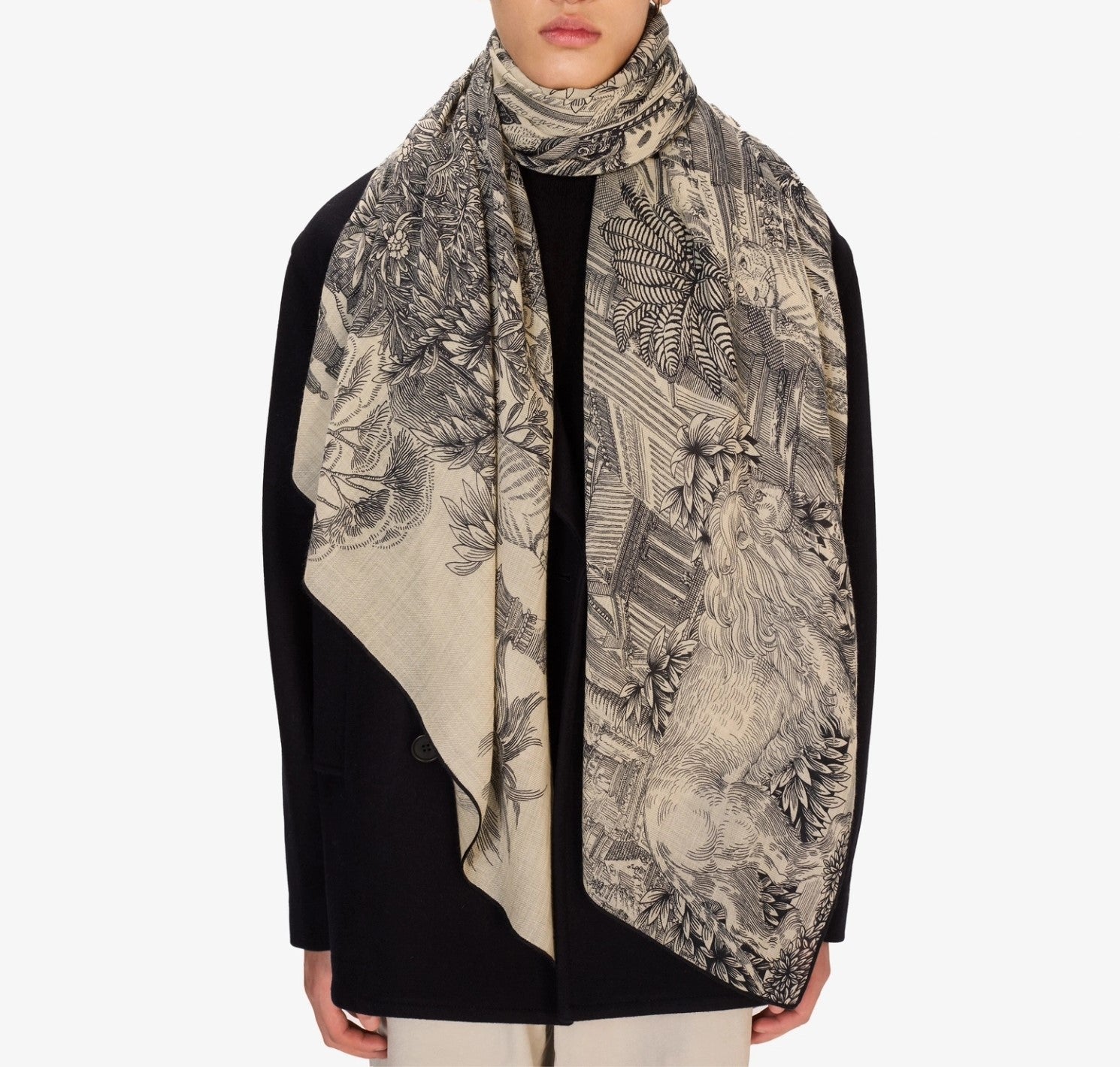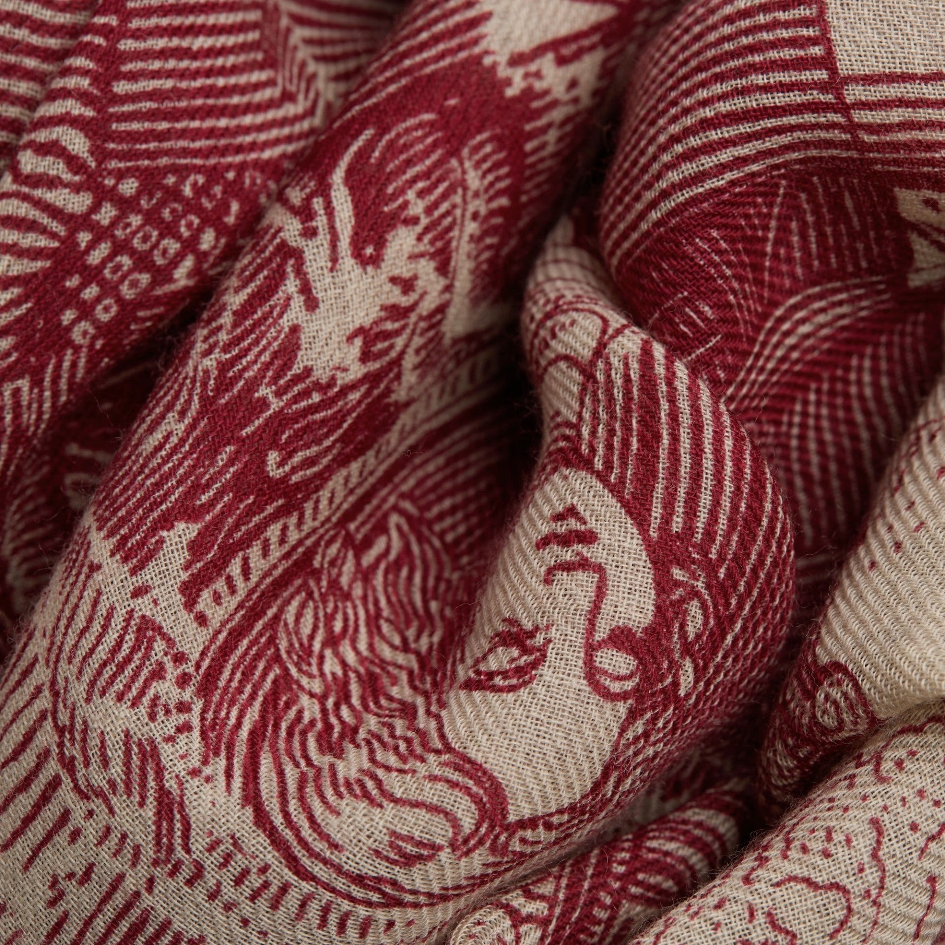The Piranesi Scarf evokes the grandeur of ancient landscapes with a finely detailed illustration inspired by classical etchings. Architectural ruins, lush flora, and mythic figures are rendered in intricate linework across its expansive frame. Blending wool with silk, it offers both warmth and fluid drape, making it a versatile accessory that carries elegance and artistry into everyday wear.