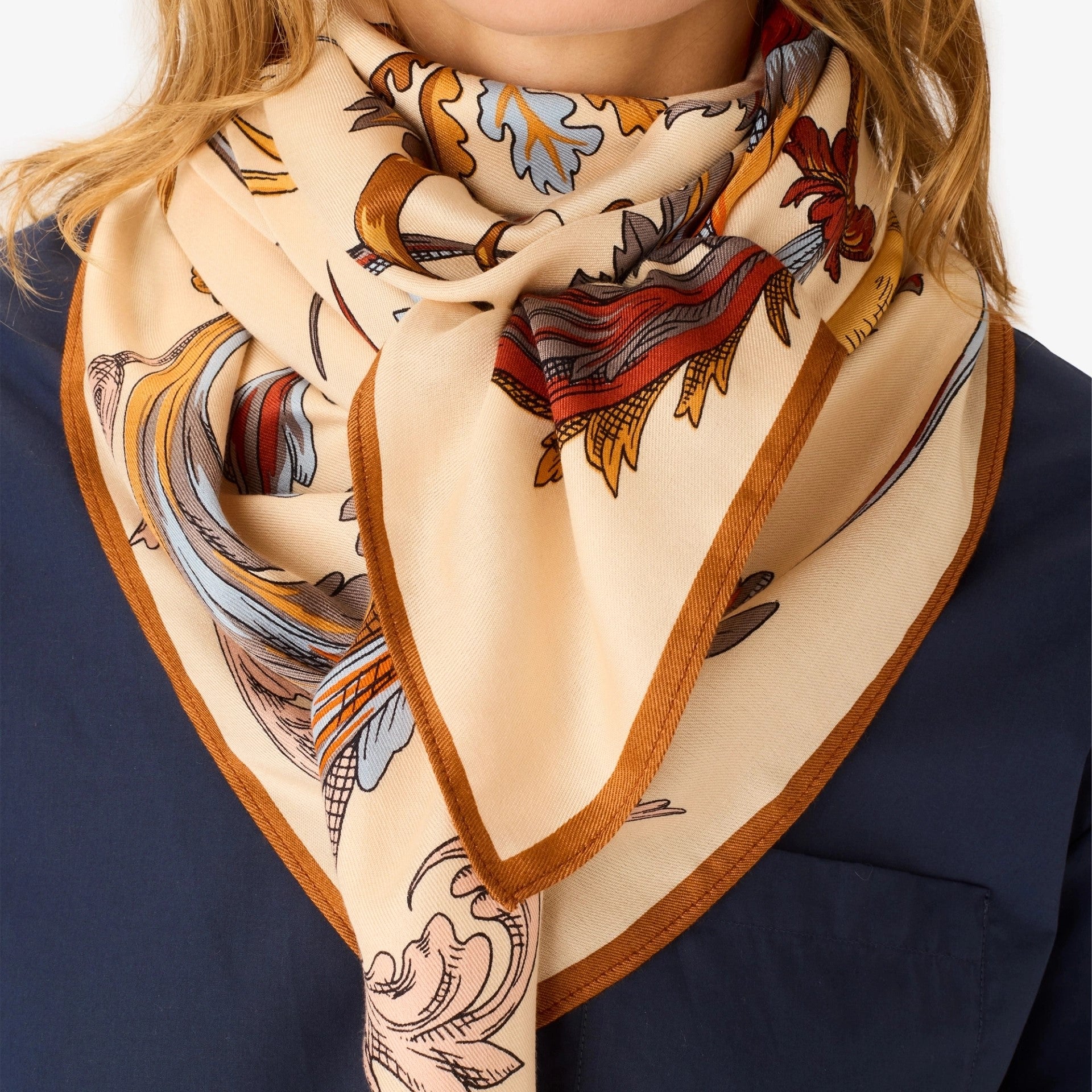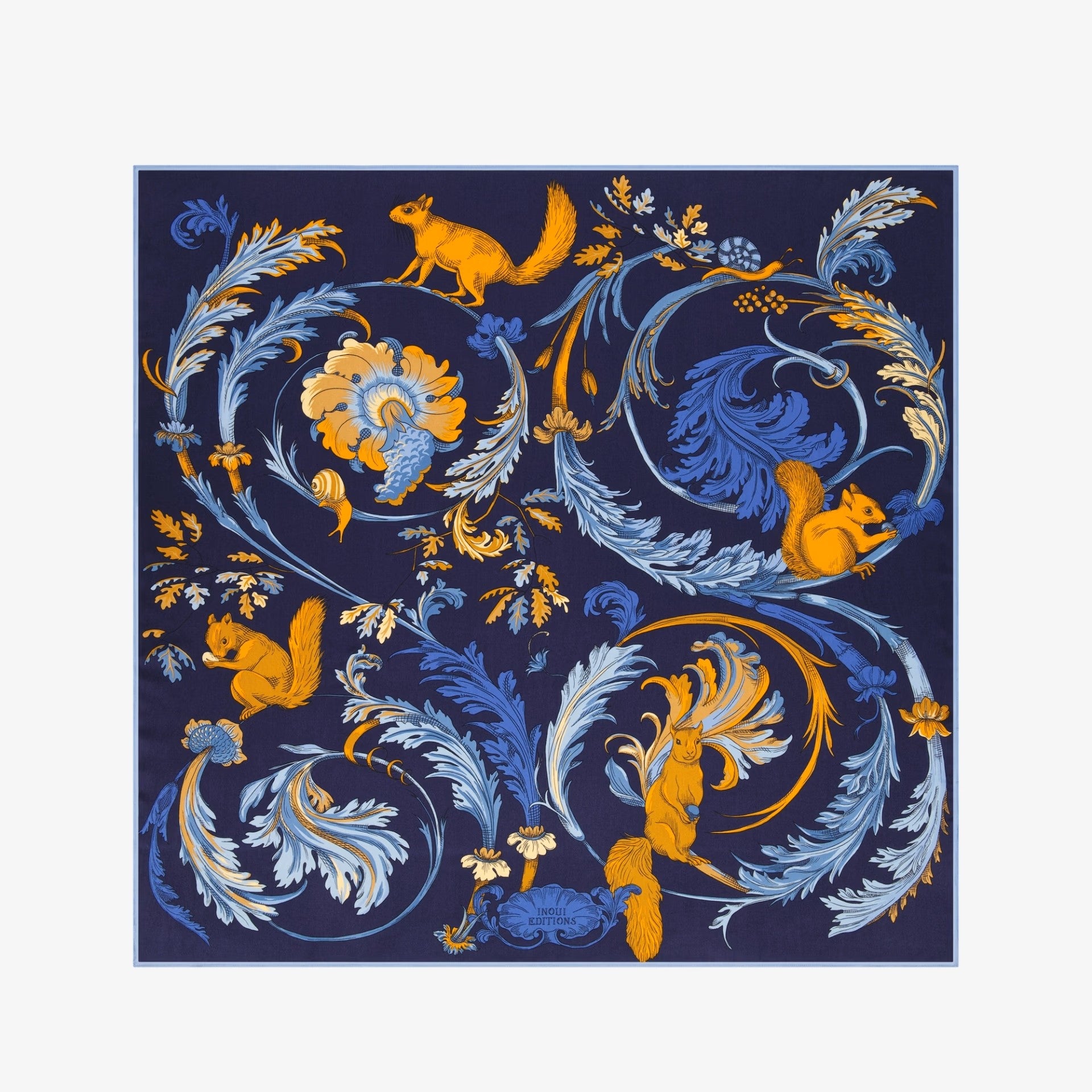 The Rococo Scarf brings playful elegance to a classic square. Squirrels, florals, and scrolling leaves weave together in an ornate, baroque-inspired pattern, blending whimsical detail with refined artistry. Crafted in a silk-modal blend, it has a soft touch and fluid drape, making it perfect for knotting at the neck, styling as a headscarf, or tying to a bag for a touch of colour.