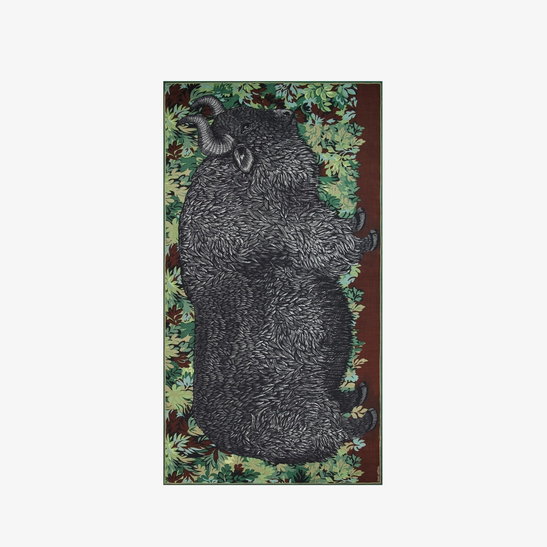 The Walter Scarf captures the strength and softness of nature through bold illustration. A striking musk ox motif rests against a backdrop of layered foliage, rendered in earthy tones that echo the wild. Woven in pure wool, its generous proportions allow it to be styled as a wrap, draped scarf, or statement shawl. Both graphic and organic, it’s a piece that blends artful design with practical warmth.