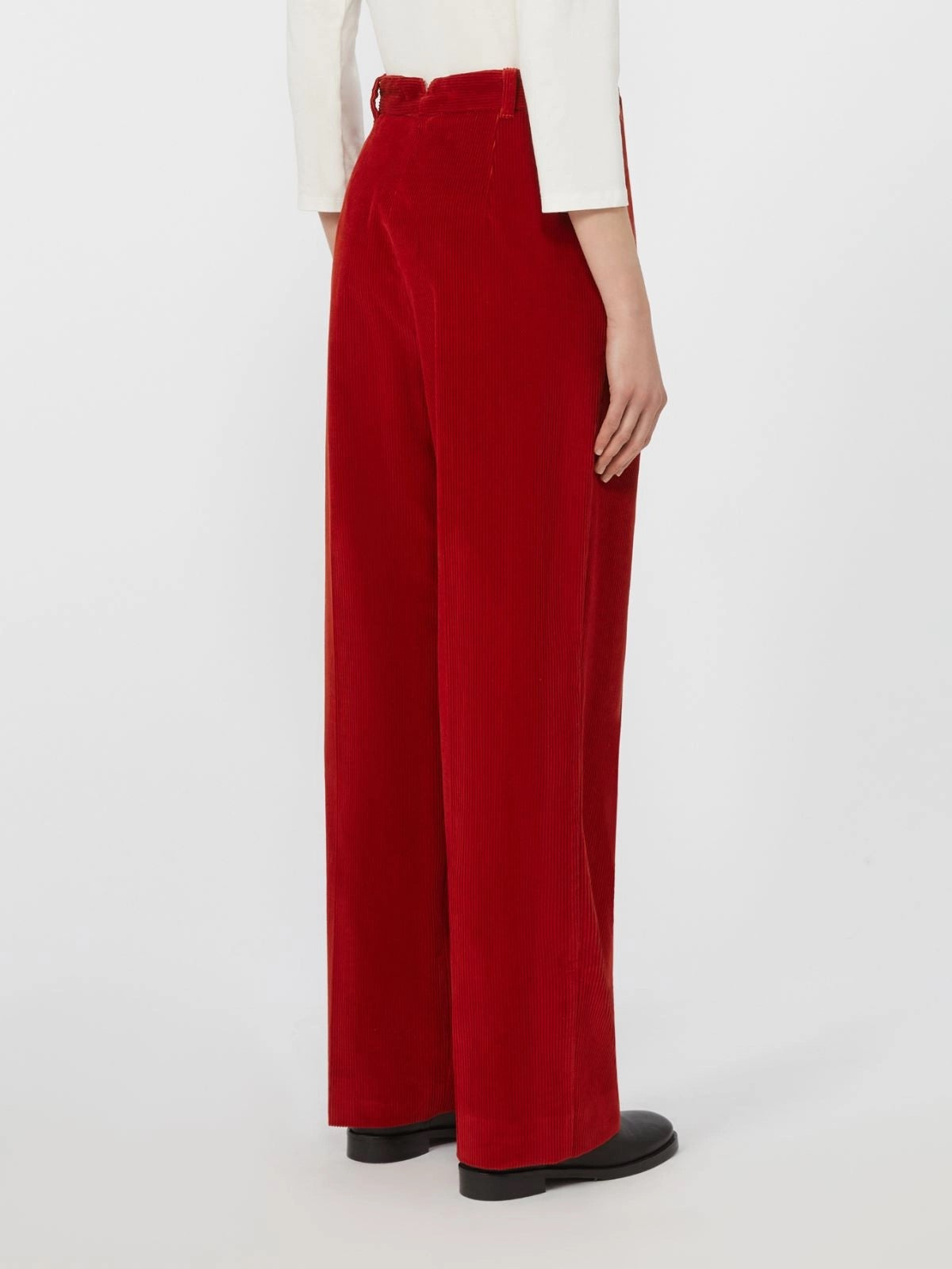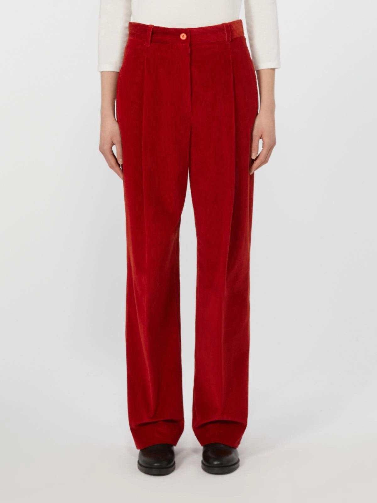 Designed as part of the Fine Settimana capsule by Giuliva Heritage for Weekend Max Mara, these trousers capture the collection’s relaxed tailoring and conscious femininity. Cut from pure cotton velvet, they feature a wide-leg silhouette that drapes with ease, offering both elegance and comfort. The design is finished with a structured waistband tab, zip fly and button fastening, plus side slant pockets and classic belt loops. Defined by a sharp front crease, they strike a balance between refined polish and effortless wearability.