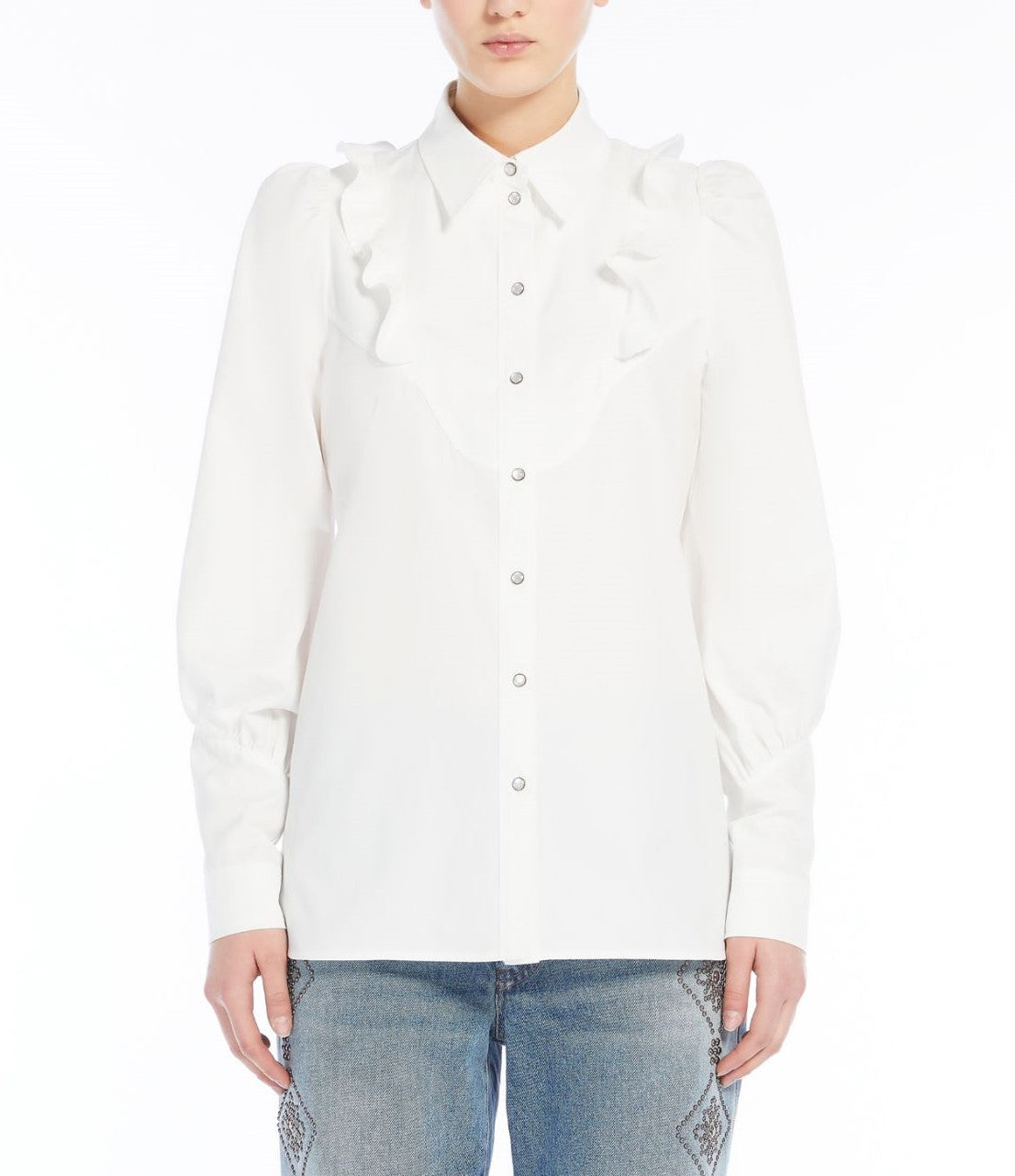 Made from lightweight pure cotton twill fabric, with plastron detailing on the front and back, ruches and gathers at the shoulders, and a shirt collar. Long sleeves feature inlay detail-decorated cuffs with mother-of-pearl-look press-stud fastening on the front for effortless style and authenticity.