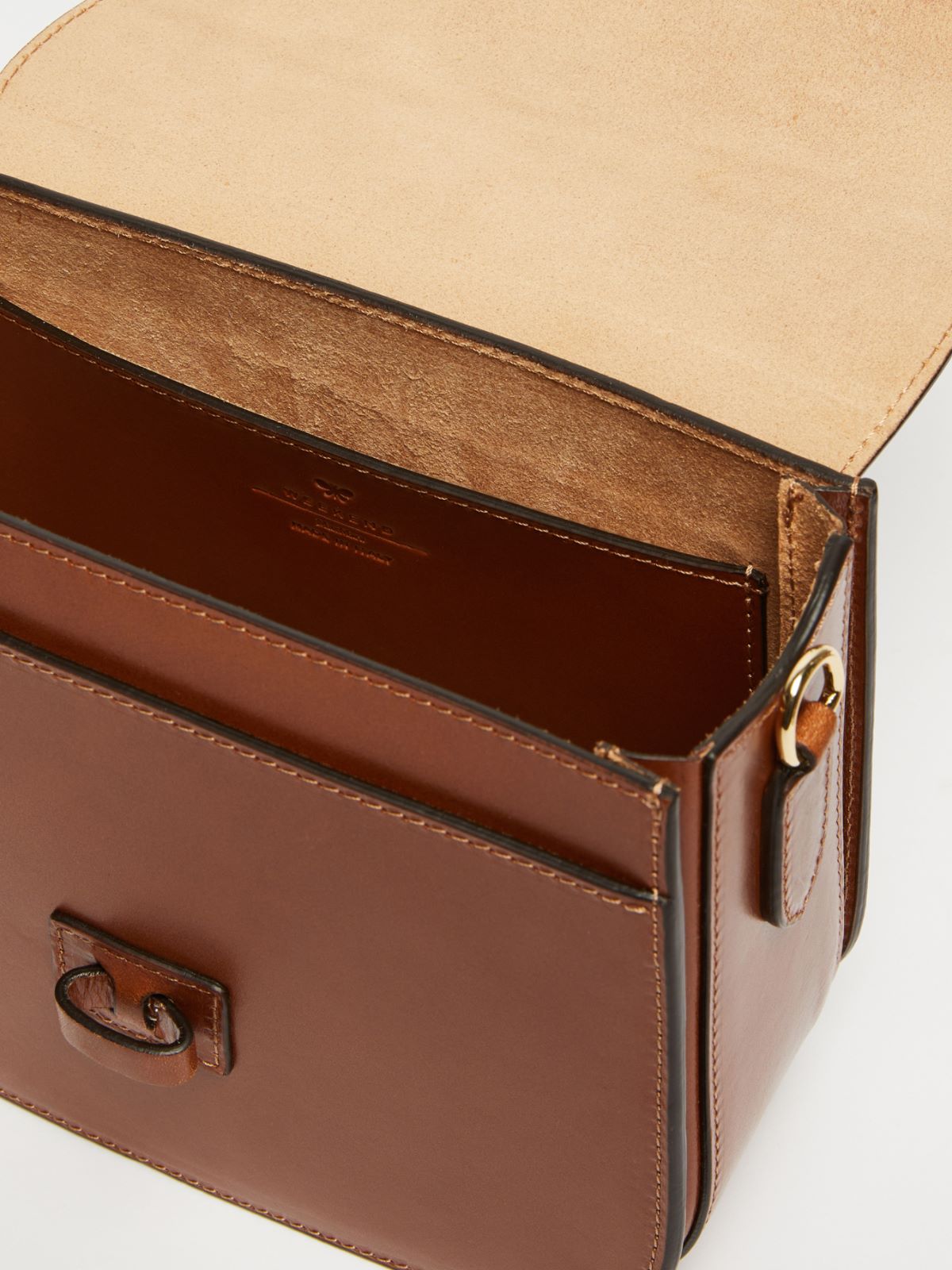 This small-sized leather crossbody bag boasts a smooth, semi-glossy texture and a wide central compartment for your daily needs. The versatile shoulder straps, featuring jacquard-knit lettering, allow for shoulder or crossbody use. With a metal W detail and flapover design, it combines style and functionality.