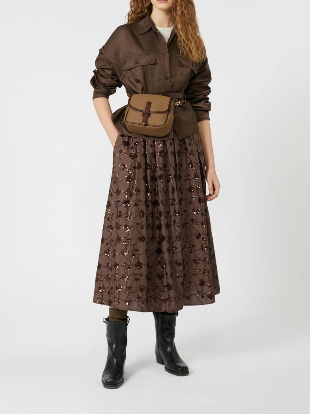 he Sequin-Embroidered Midi Skirt brings a statement shimmer to refined everyday dressing. Crafted from pure cotton poplin, this eye-catching piece features an all-over sequin-embroidered design that adds texture and subtle shine. Its comfort fit and elasticated waistband provide ease of movement, while the side zip fastening ensures a clean silhouette. Fully lined for a smooth feel against the skin, it pairs effortlessly with minimal knits or crisp shirting for a modern take on elevated style.