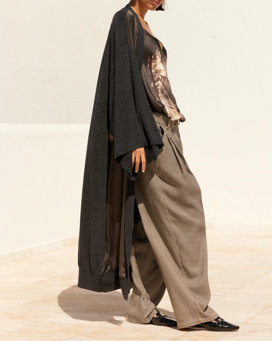 The Angus kimono is a refined blend of softness and artistic contrast. This long cardigan features a flowing silhouette crafted in fine black merino wool, elegantly paired with a printed satin silk front. The landscape motif brings a poetic, graphic dimension, adding visual depth and movement. Designed with wide kimono sleeves for a relaxed, draped effect, it comes with a tone-on-tone belt that can be tied to define the waist. Balancing comfort and sophistication, the Angus kimono plays beautifully with texture and light, making it a standout layering piece for transitional dressing.