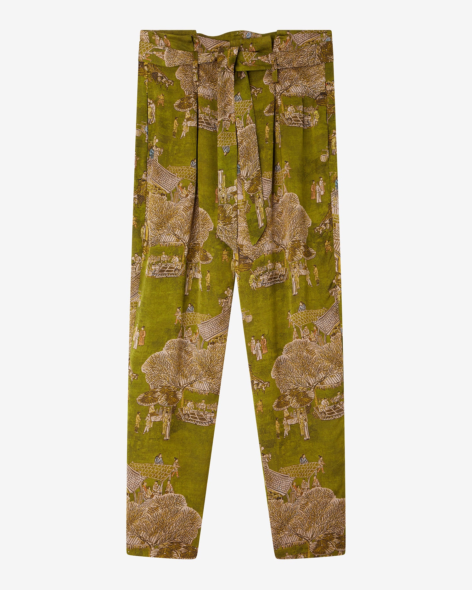 Make a bold yet graceful statement with these scenic print trousers, crafted from soft 100% viscose for a fluid, breathable drape. The rich olive green base is adorned with an intricate landscape design—evoking tales of tradition, nature, and quiet village life. A self-tie paperbag waist adds structure and femininity, while the relaxed tapered leg keeps it effortlessly wearable.