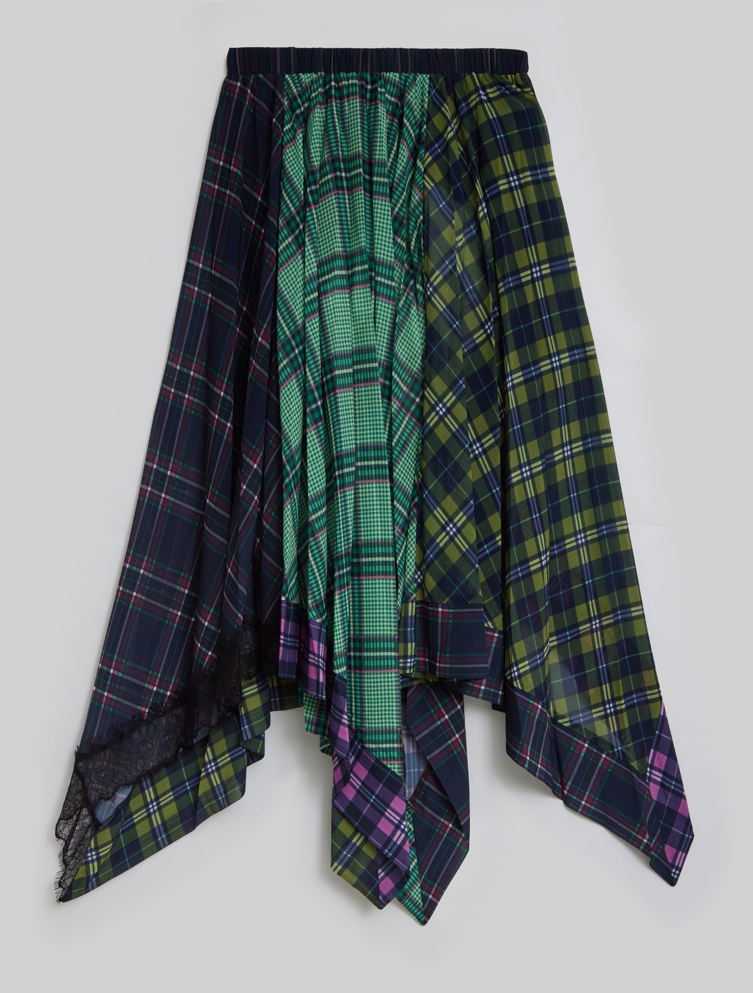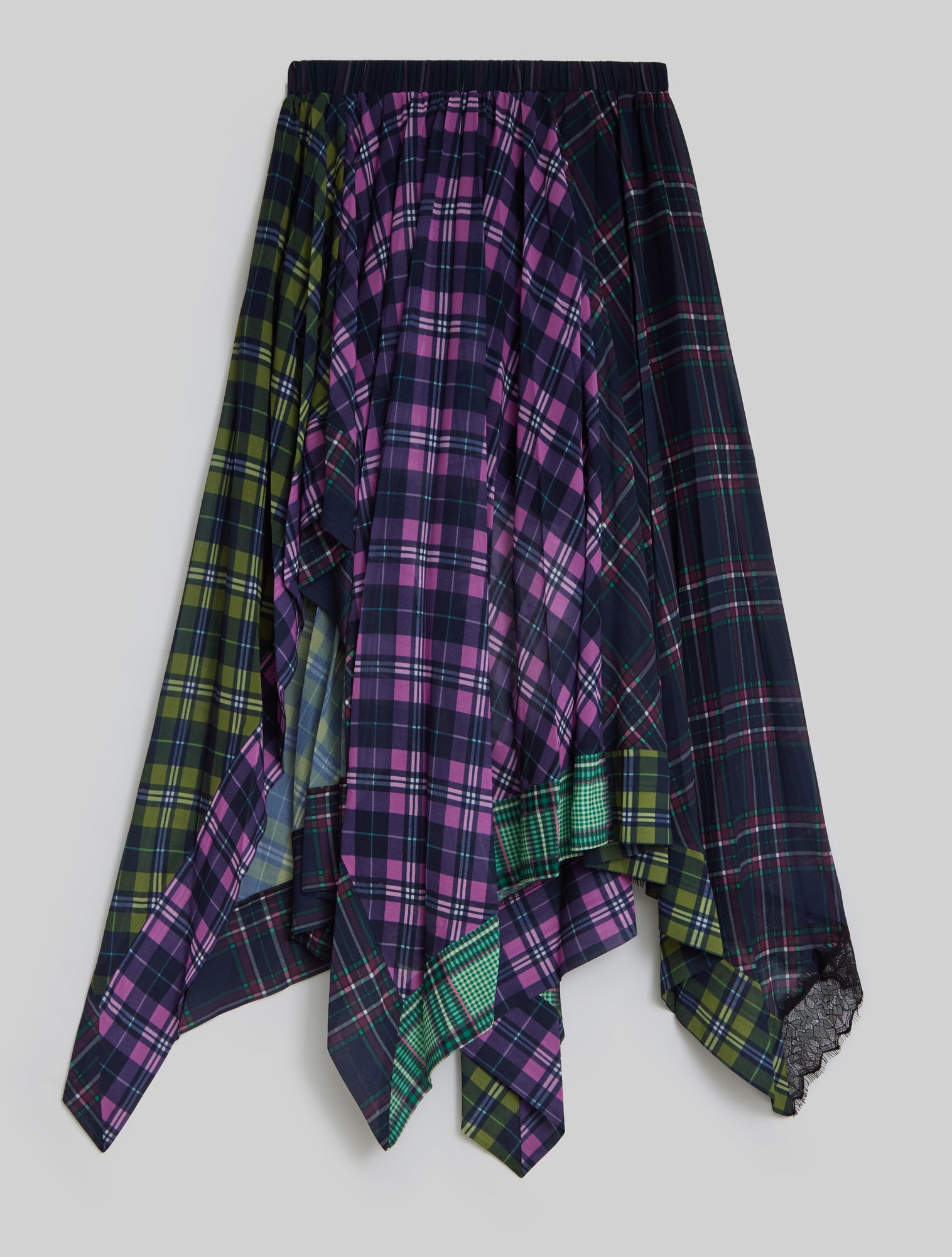 The Thorn Skirt is a unique patchwork of tartans in shades of purple, pink, green, and navy, reimagining a heritage pattern with modern attitude. A gathered waistband creates soft volume, while the asymmetric handkerchief hem gives the silhouette an expressive, sculptural edge. A pop of delicate lace trim contrasts with the bold checks, striking a balance between edgy and feminine. This unique and versatile piece balances statement design with everyday wearability.