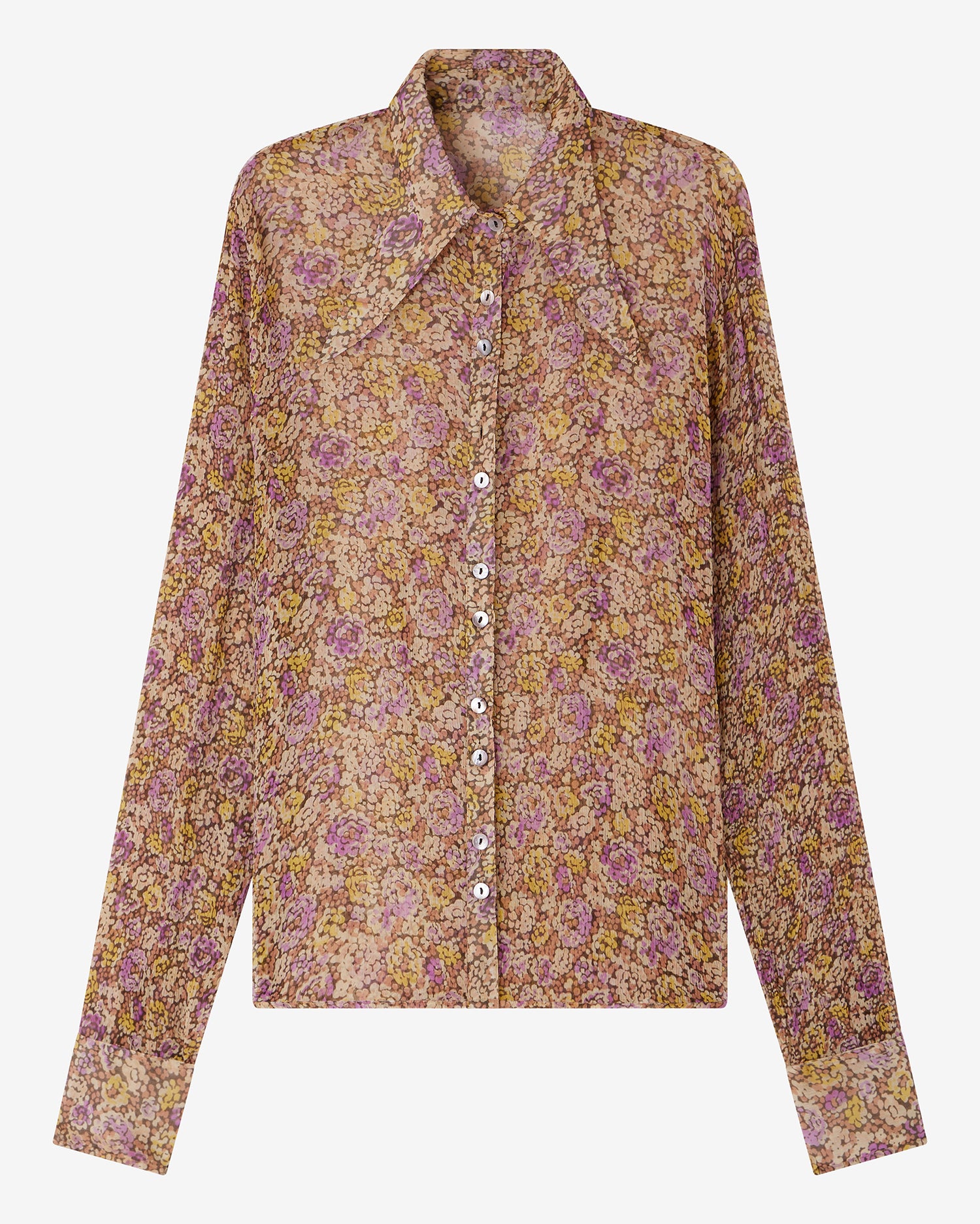 A lightweight long-sleeve shirt featuring an all-over floral print in soft purple, ochre, and beige tones. This piece includes a structured pointed collar, full button front, and classic cuffs. The fluid fabric gives it a relaxed feel while maintaining a polished silhouette.