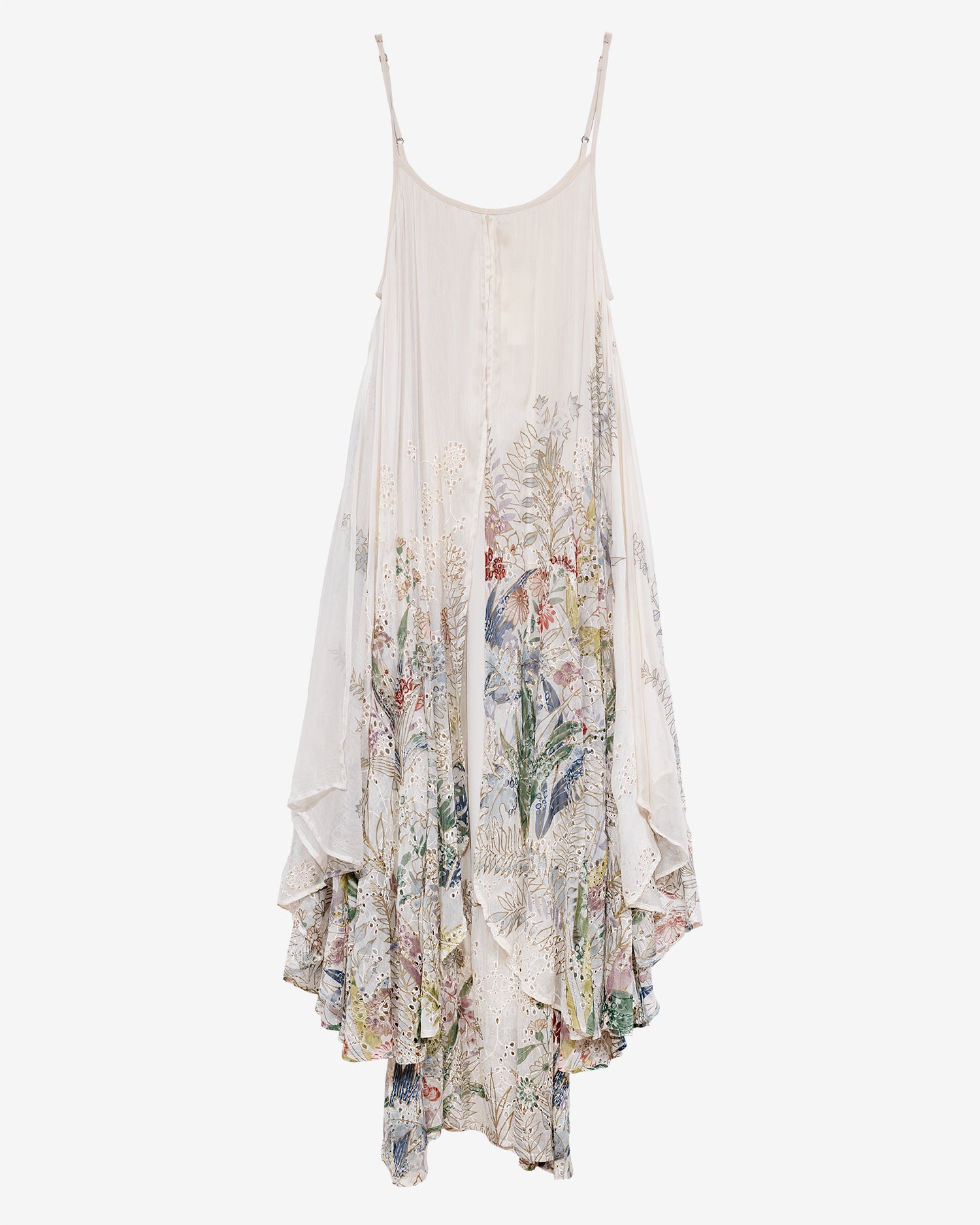 This sleeveless layered dress features two distinct layers: a full-length silky slip base, and a gossamer outer shell adorned with delicate cutwork embroidery and a vivid, painterly botanical print. Adjustable straps offer a flexible fit, while the asymmetric hem adds fluidity and movement.
