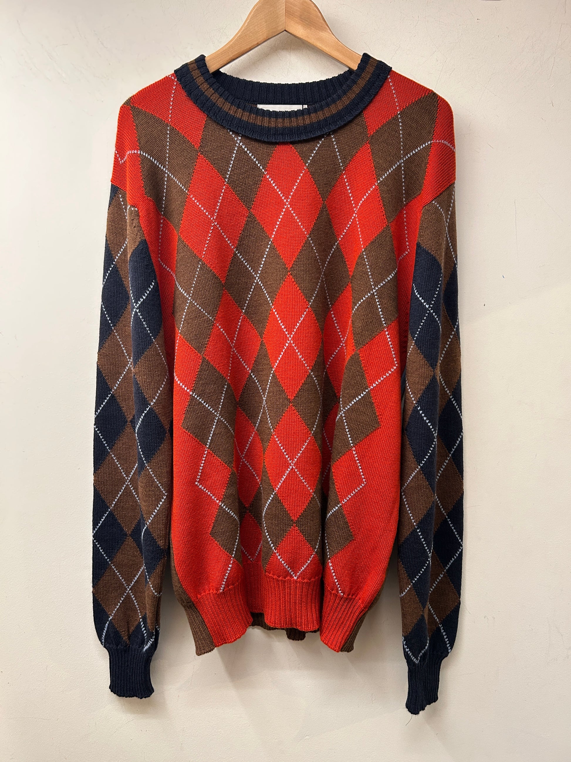 A timeless classic from Pringle of Scotland, this jumper celebrates the brand’s heritage in knitwear. Crafted in Scotland from 100% merino wool, it features a bold orange and brown argyle pattern across the front, complemented by navy sleeves and collar detailing. The back introduces a contrasting pale blue stripe for a unique touch.