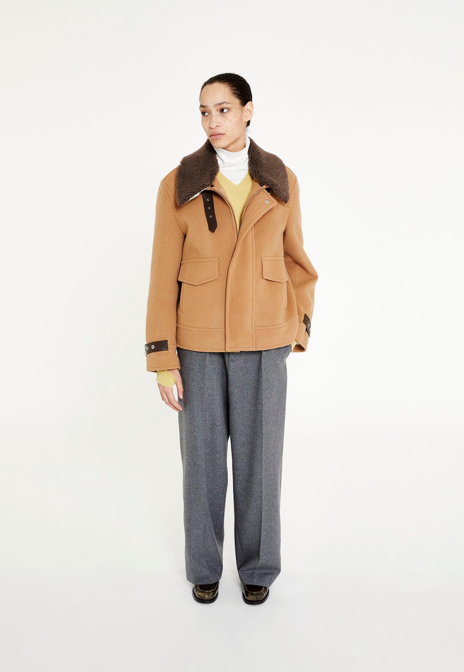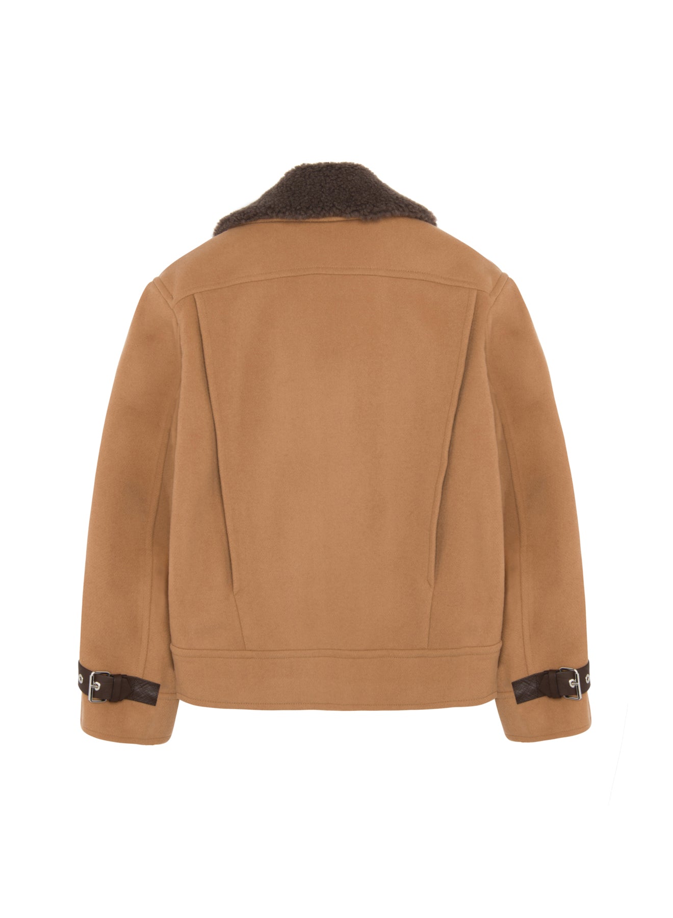This wool cloth sherpa jacket with contrasting collar and straps is a stylish and modern twist on classic winter wear. This boxy fit jacket is the right choice for regular sizing and will keep you warm all season long.